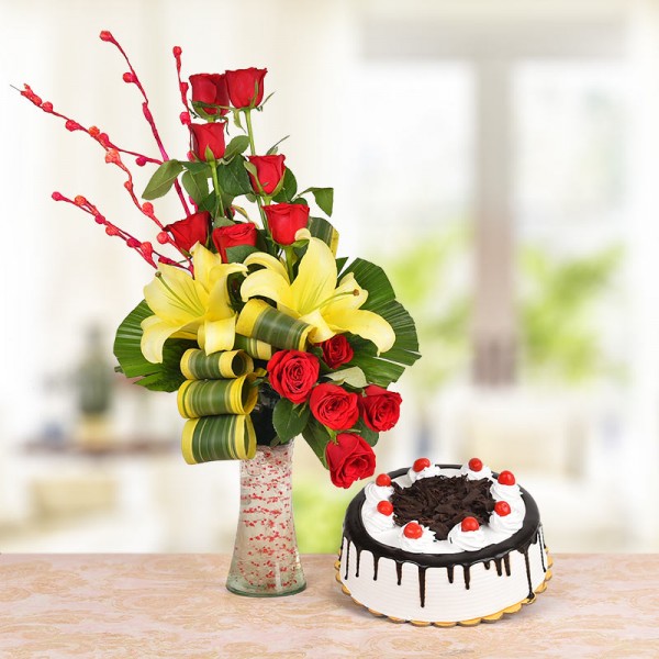 Step into a world of sweetness with the warmth of a simple Life Combo. This enchanting combo features a delectable Chocolate cake paired with a vibrant bouquet of yellow lilies, roses, elegantly arranged in a glass vase. Perfect for birthdays, anniversaries, or to brighten some ones day, this set suits individuals who exude warmth, positivity, and appreciation for life simple pleasures. The yellow lilies symbolise gratitude and happiness, while the Red roses signify admiration and purity, complementing the rich, comforting flavours of the Butterscotch Cream Cake. Celebrate in style with this exquisite ensemble, capturing the essence of sunshine and serenity.