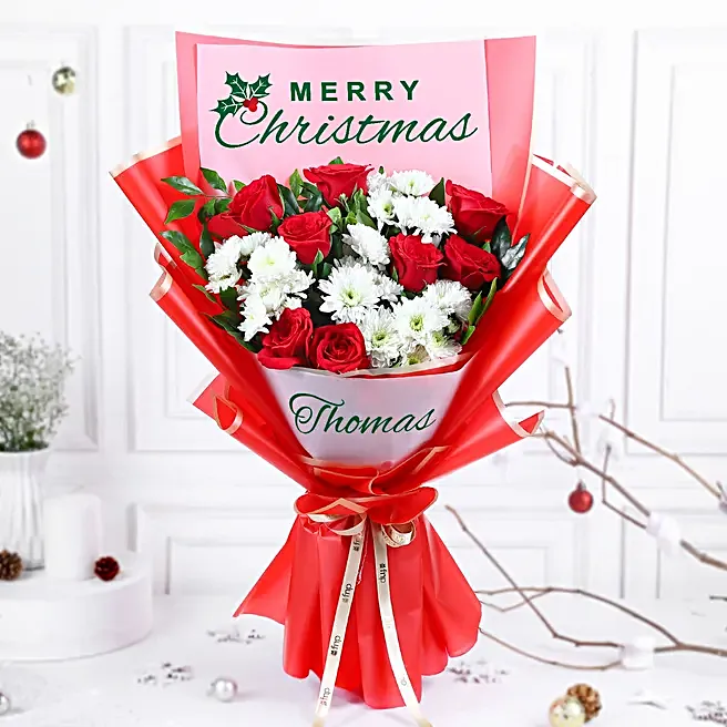 Celebrate the spirit of Christmas with this enchanting bouquet of red roses and white daisies, beautifully wrapped in white and red sheet. This thoughtful gift radiates warmth and love, making it the perfect gesture for family, friends, or colleagues. The vibrant flowers symbolise love and purity, adding a touch of elegance and holiday cheer while creating lasting memories filled with joy and appreciation.